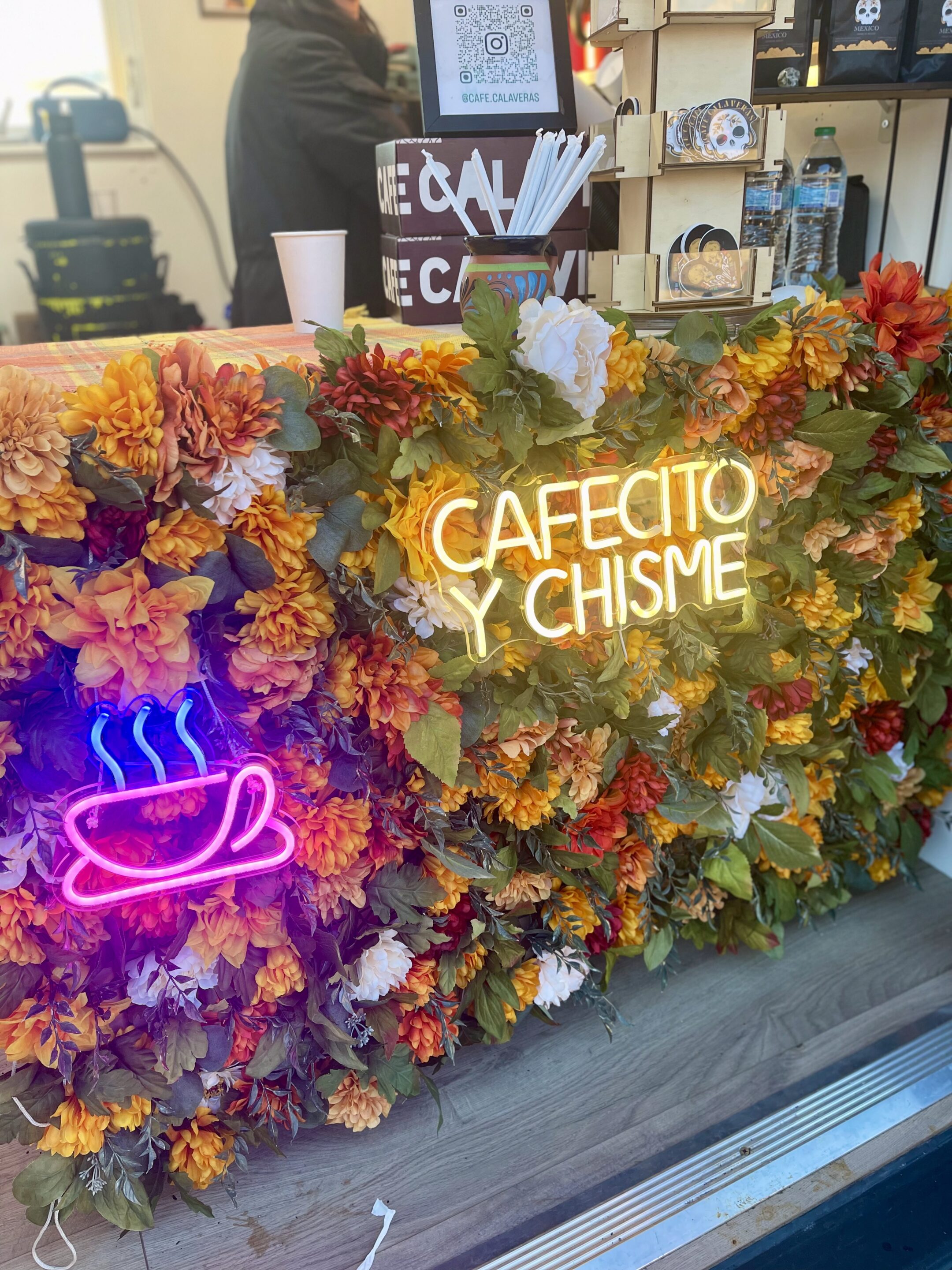 - A flower wall with Café Calaveras’ recognizable neon sign.
