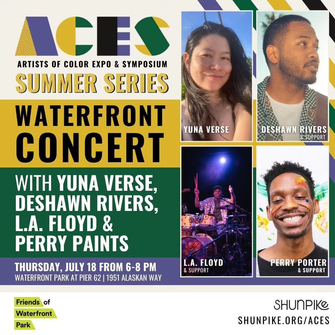 Join Friends of Waterfront Park and Shunpike on July 18th from 6 PM to 8 PM at Pier 62 for a free and family-friendly concert featuring four local performers, Yuna Verse, Deshawn Rivers, L.A.Floyd, and Perry Porter!