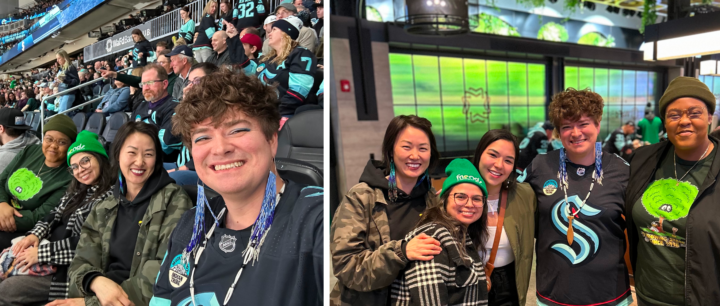 - (Left) Jordan takes a self along with Friends staff members, Yoon Kang O’Higgins, Maria Reyna and Denise Evans. (Right) Jordan (middle) celebrating at a 2024 Kraken game with Friends staff.