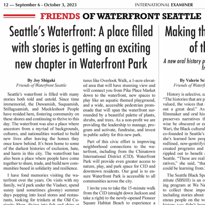 Here is a collection of some of those stories and histories, both good and bad. Through the voices, wisdom, and memories of those who have come before, we can continue to foster communal solidarity and resilience, and ensure Waterfront Park and all of Seattle’s waterfront neighborhood is welcoming and inclusive to the diverse communities of Seattle.